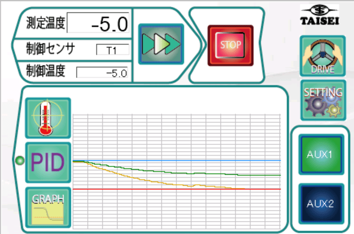 起動するとこのページが表示されます。この状態は、ペルチェを駆動しており、制御センサはT1で、制御温度が-5℃、その測定温度は-5です。また、AUX1はONの状態です。
